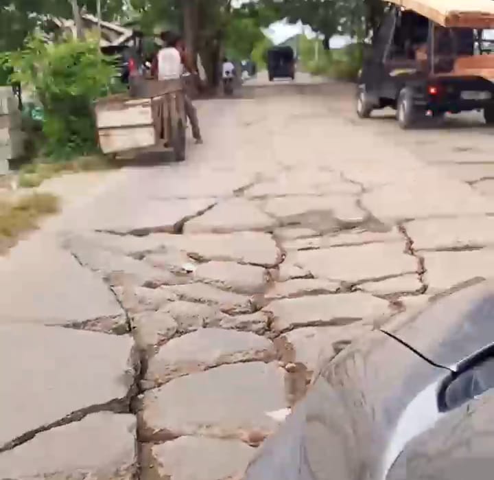 ‎Pantauan di lapangan menunjukkan lubang besar menganga di sejumlah titik, dengan kondisi beton pecah tingkat parah dan menciptakan jalan menjadi condong dalam pada permukaan. Situasi ini memaksa pengendara sepeda motor dan mobil melambat mendadak atau bermanuver menghindari lubang, sehingga meningkatkan risiko kecelakaan lalu lintas.