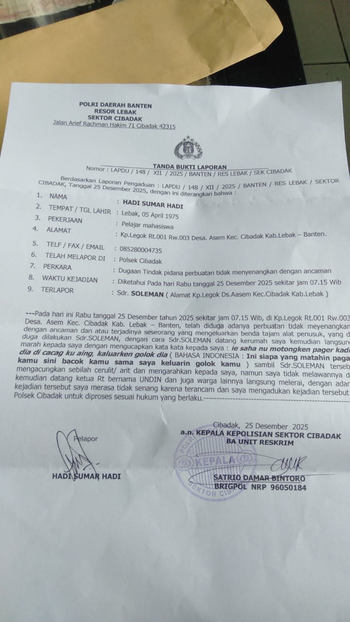 Atas peristiwa tersebut, korban telah melapor secara resmi ke Polsek Cibadak, sebagaimana tertuang dalam Tanda Bukti Laporan Nomor: LAPDU/148/XII/2025/Banten/Res Lebak/Sek Cibadak.