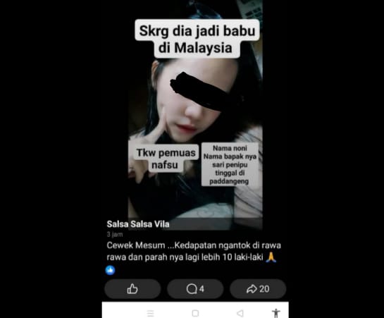 Dalam konten yang menyertakan gambar NN, seorang TKW yang kini bekerja di Malaysia dan tidak terkait dengan kasus, teks-teks menusuk menghina menumpuk tuduhan merusak: NN dicap “pelakor, pelacur, penipu” tanpa bukti apapun; almarhum ayahnya, yang telah meninggal beberapa tahun, dituduh sebagai perampok dan penipu; adiknya Fais disebut “adik buronan” yang sering merampok kelapa di kebun orang; sedangkan NN sendiri dituduh menyalahgunakan semen kerja dan menjual anjing milik orang lain. Seluruh keluarga pun dikolektifkan sebagai penipu, pembohong, dan tidak bertanggung jawab.