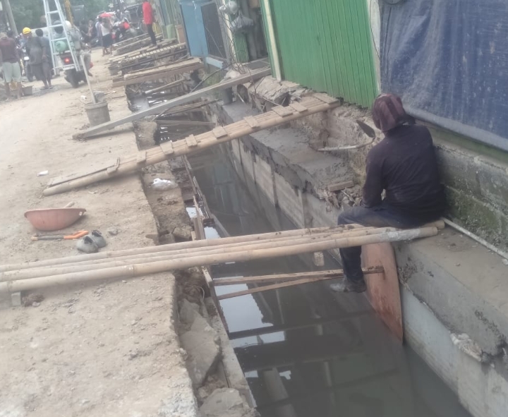 Kondisi lapangan memperparah situasi. Pekerjaan dipaksakan berlanjut meskipun saluran tergenang air banjir yang meluap.