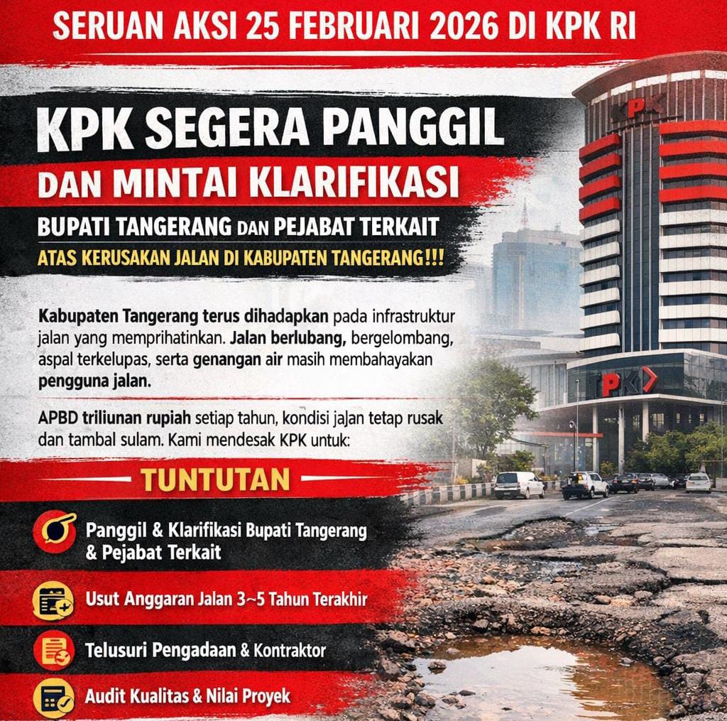 http://Rajawali Times tv.com Kabupaten Tangerang – Puncak kekecewaan masyarakat terhadap rusaknya infrastruktur jalan di Kabupaten Tangerang akhirnya akan bermuara pada aksi besar-besaran. Ratusan massa (Masyarakat ) dari berbagai elemen sipil dijadwalkan akan ikut menggelar demo akbar pada Rabu, 25 Februari 2026, dengan mendatangi Gedung Komisi Pemberantasan Korupsi (KPK) RI di Jakarta.