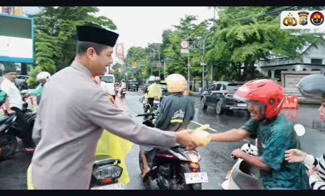 Dengan penuh kehangatan, Kombes Pol. Arya Perdana turun langsung ke jalan, menyapa para pengendara, ojek online, pedagang kecil, hingga pejalan kaki yang masih dalam perjalanan pulang. Satu per satu takjil dibagikan, diiringi ucapan selamat menunaikan ibadah puasa.