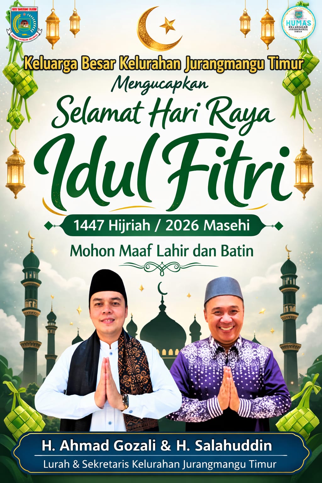 Lurah Jurangmangu Timur, H. Ahmad Gozali, bersama Sekretaris Kelurahan H. Salahuddin, menyampaikan ucapan tulus kepada seluruh warga dengan pesan penuh makna, “Selamat Hari Raya Idul Fitri 1447 Hijriah / 2026 Masehi, Mohon Maaf Lahir dan Batin.”