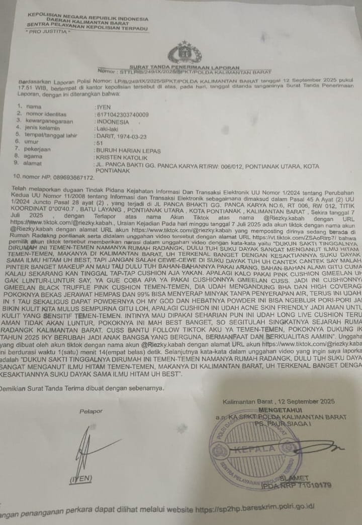 Laporan pengaduan itu kini resmi tercatat dalam LP Nomor: STTLP/B/249/IX/2025/SPKT/Polda Kalimantan Barat.