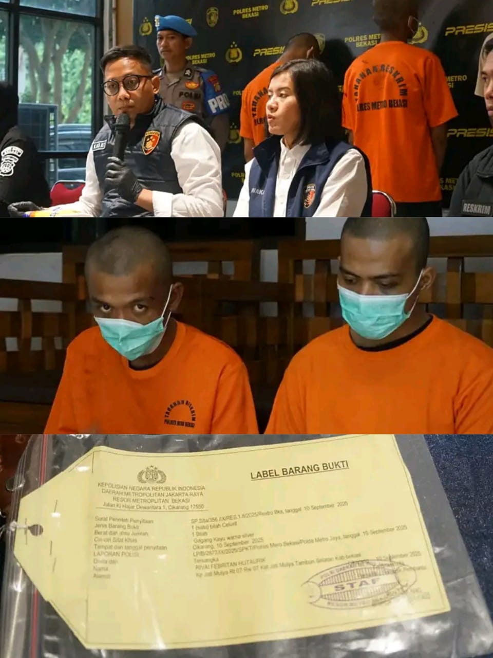Kapolres Metro Bekasi Kombes Pol Mustofa, S.I.K., M.H., melalui Kasat Reskrim AKBP Agta Bhuwana Putra, S.I.K., M.A.P., menjelaskan pelaku yang ditangkap yakni Eko Paulus alias Eko (22) dan Rivai Febrian Hutahuruk (21). Sementara satu pelaku lain bernama Nuel berhasil kabur dan kini masuk daftar pencarian orang (DPO).