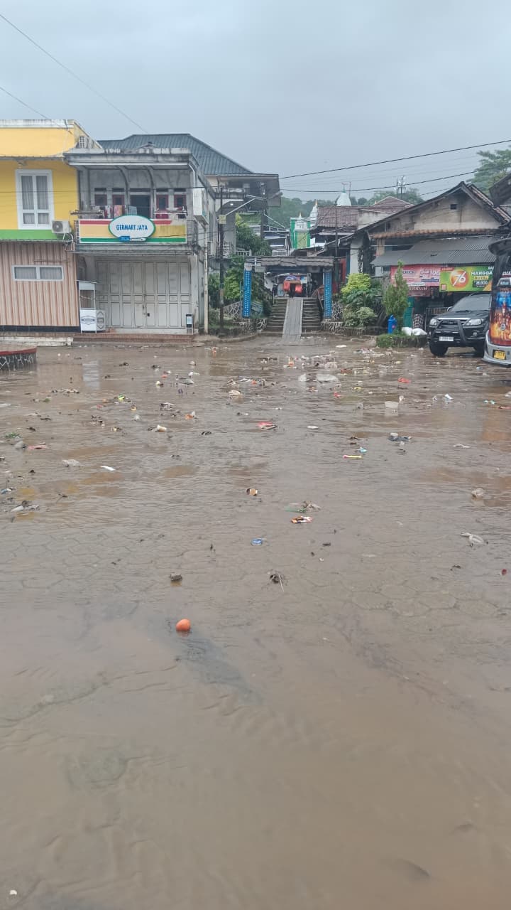 Hujan yang turun beberapa jam membuat air meluap akibat drainase yang tersumbat. Sampah plastik, bungkus makanan, botol, hingga limbah domestik lainnya terlihat mengapung di seluruh area terminal. Kondisi ini memberikan kesan kumuh dan tidak terurus.