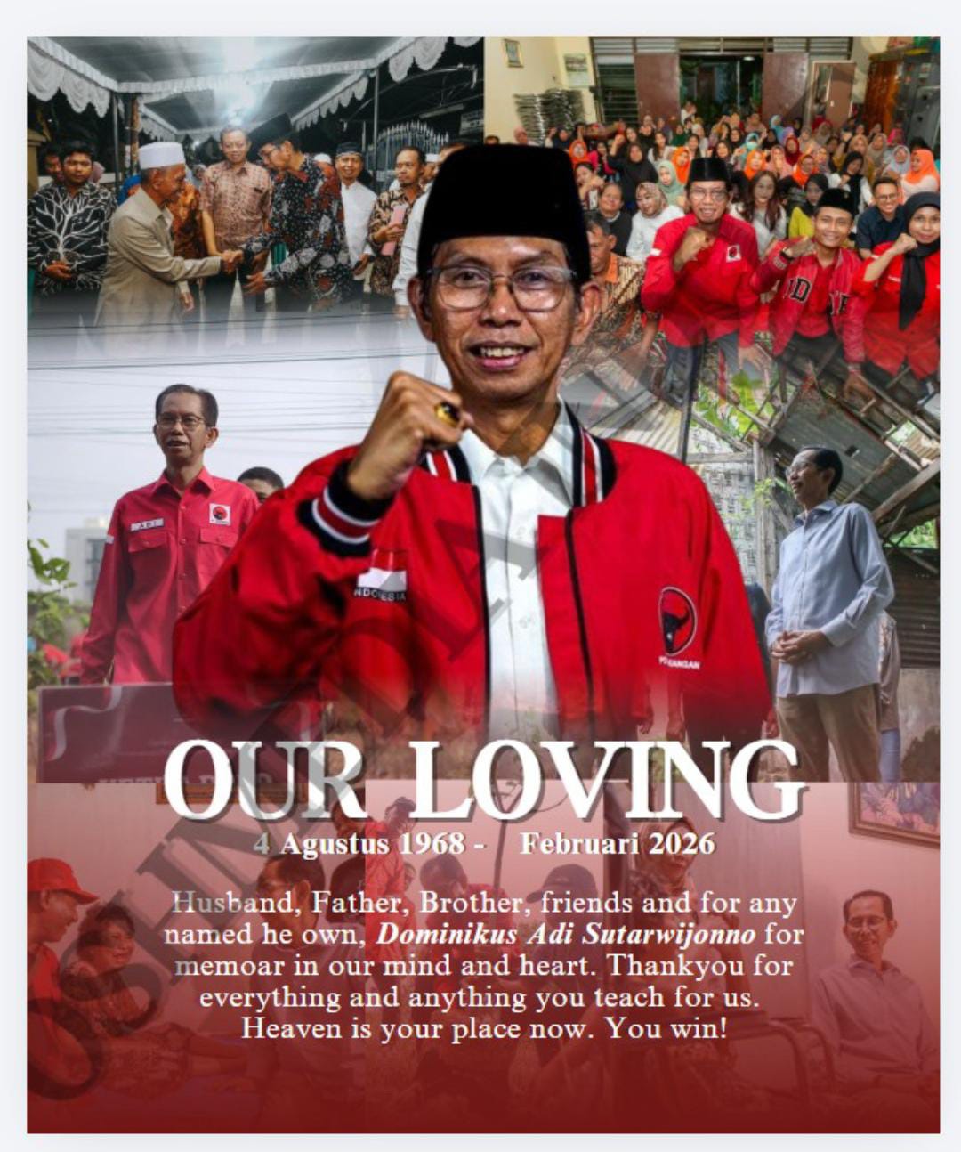 Sekretaris DPD PDI Perjuangan Jawa Timur, Deni Wicaksono, menyampaikan duka cita yang mendalam atas wafatnya Adi.