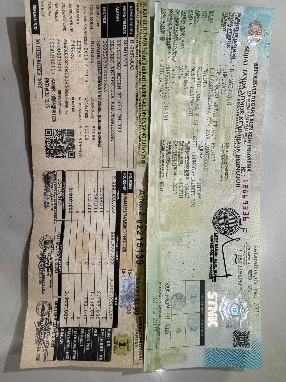 Pengumuman: Telah Hilang BPKB Kendaraan Roda 4., Merek Toyota., Type: Kijang Innova V AT Diesel (KUN4OR-GKPNHD 10)., Jenis : Mobil Penumpang ., Model : Minibus., Tahun Pembuatan : 2004., Isi Slinder 2494 CC., No Rangka/Nik/Vin : MHFXR43G4E1014591., Nomor Mesin : 2KDU603909., Atas Nama : Sumiati. Alamat : Kp Cibogo wetan RT 001 RW 003 Desa Kelapa Dua, Kecamatan Kelapa Dua, Kabupaten Tangerang.