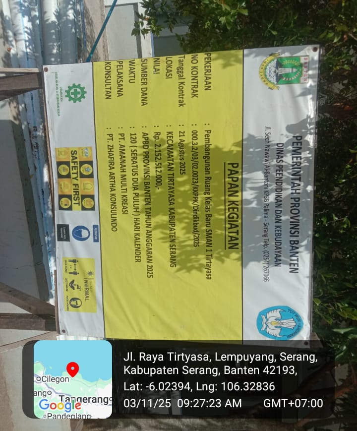 Kejanggalan makin terlihat pada Proyek Pekerjaan Pembangunan Ruang Kelas Baru SMAN I Tirtayasa dengan nilai Pagu Rp 2.152.512.000 Dengan No Kontrak 000.3.2/03/02.0023/KKPPK/Dindikbud/2025 Sumber dana APBD Provinsi Banten TA 2025 Kurun waktu 120 Hari kalender dengan pelaksana PT. AMANAH MULTI KREASI Dan Konsultan Pengawas PT. ZHAPIRA ARTHA KONSULINDO Terlihat dilapangan, para pekerja yang minim menggunakan safety standar keselamatan kerja (K3) seperti alat pelindung diri (APD) helm, sepatu proyek, maupun rompi keselamatan.