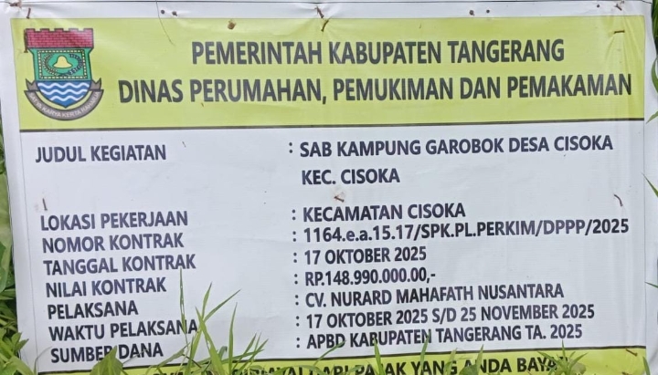 Proyek yang dikerjakan oleh CV. Nurard Mahafath Nusantara di bawah pengawasan Dinas Perumahan, Pemukiman, dan Pemakaman (Perkim) Kabupaten Tangerang, dengan jadwal pengerjaan 17 Oktober – 25 November 2025, kini dipertanyakan kualitas dan integritasnya.