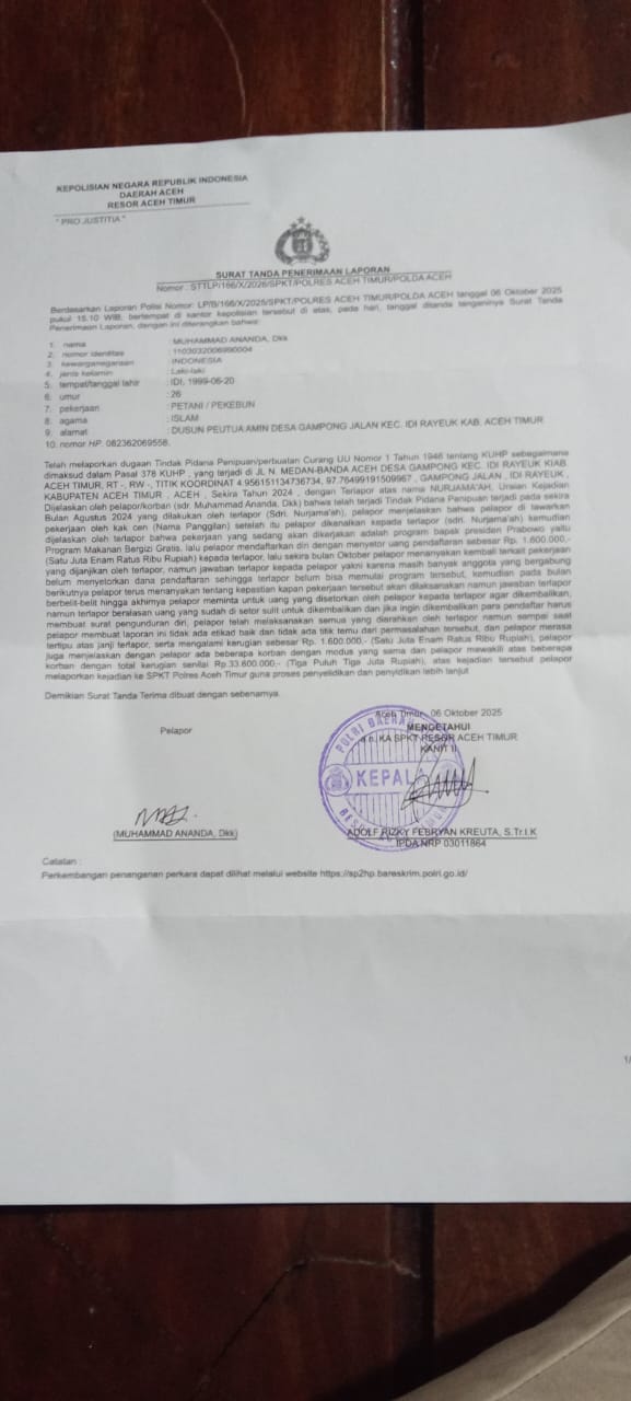 Dari hasil penelusuran ormas Laki Puluhan warga di Kabupaten Aceh Timur diduga menjadi korban penipuan yang dilakukan oleh oknum bendahara DPW Prabu Satu Aceh Timur. Dengan modus menjanjikan pekerjaan melalui program pemerintah bernama MBG, oknum tersebut berhasil memperdaya masyarakat dan membuat setidaknya 20 orang menjadi korban, bahkan hal itu mereka mengalami kerugian.