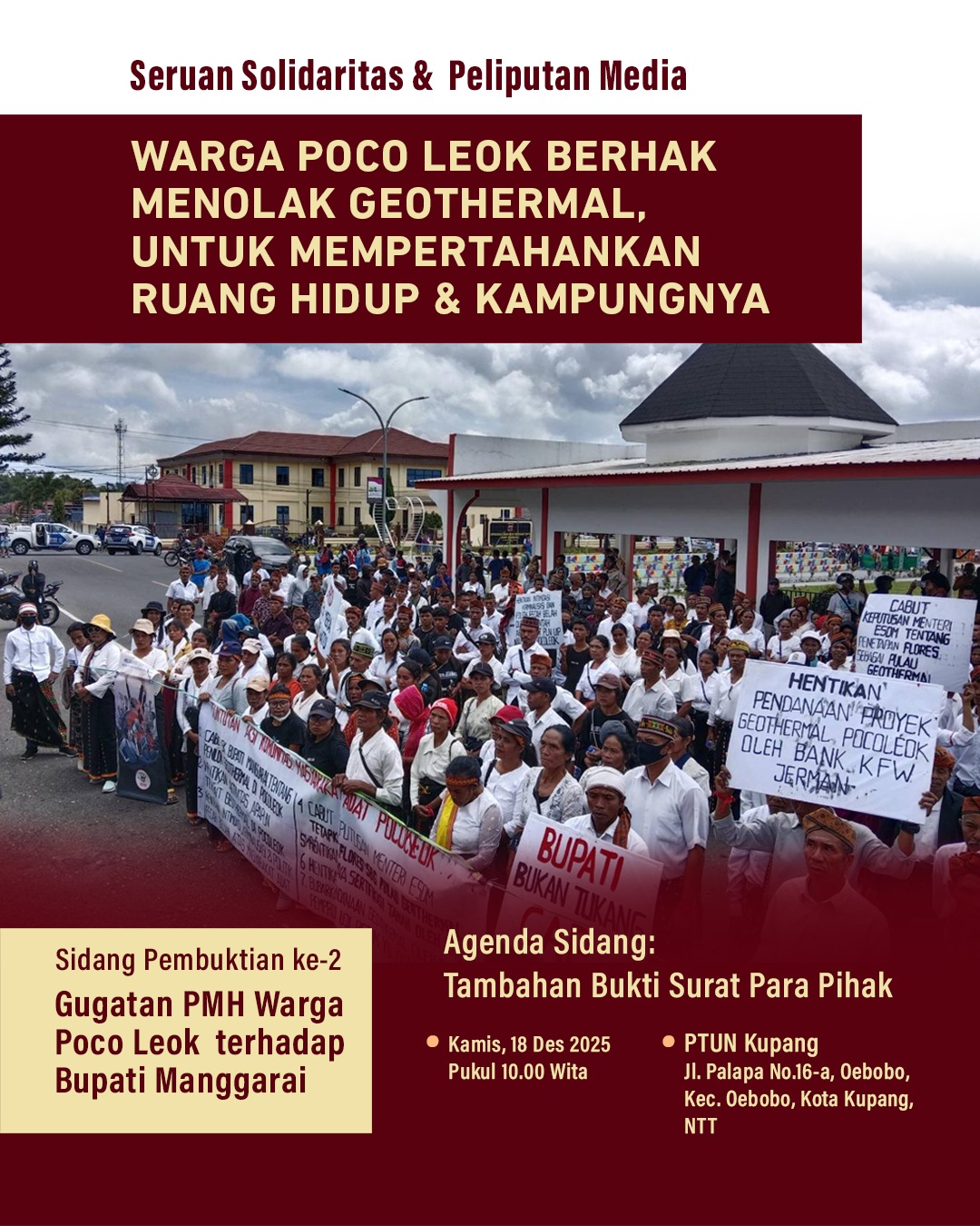 Kami juga mengundang jurnalis dan media untuk meliput persidangan ini sebagai pilar demokrasi yang berpihak pada suara rakyat dan mendukung perjuangan masyarakat Poco Leok untuk mempertahankan ruang hidup dan kampungnya.