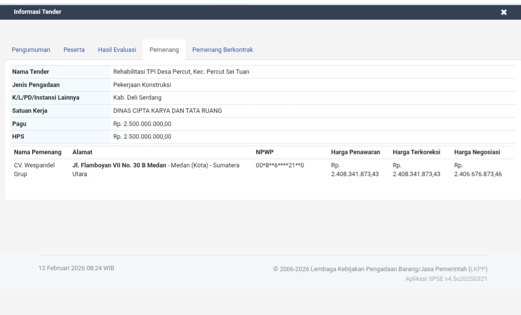 Sebelum nya Proyek (TPI) Tempat Pendaratan Ikan Desa Percut Kecamatan Percut Sei tuan Kabupaten Deli Serdang senilai Rp2,5 miliar bermasalah.Rekanan melanggar jadwal masa kontrak pekerjaan dimana seharusnya Kegiatan itu rampung diakhir Desember 2025. Sementara pemerintah dalam hal ini Dinas Cipta Karya dan Tata Ruang (CKTR) Deli Serdang, sudah melakukan pembayaran 100% atau lunas.